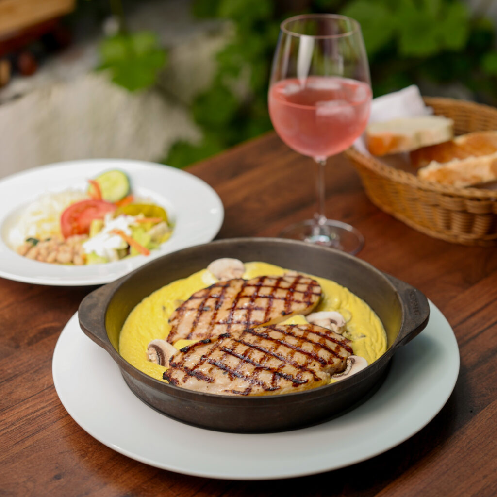 Feta-Sauce: Unsere Feta-Sauce besteht aus Sauce Bernaise, Sahne, geriebenem Schafskäse, griechischem Weißwein, verfeinert mit frischen Kräutern und Champignons